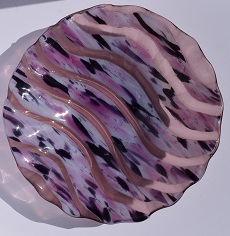 Pink see through glass layered with a mixture of pink black and white glass, with a clear glass coat to give it an inset look.